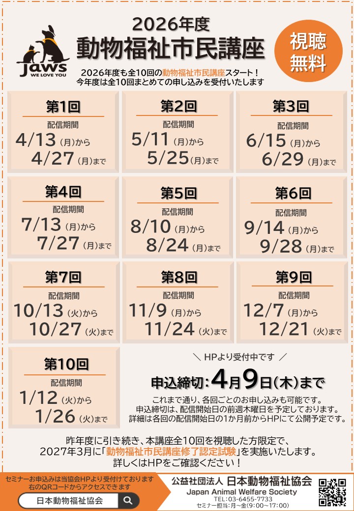 今年度もJAWS動物福祉市民講座(全10回)を配信いたします。